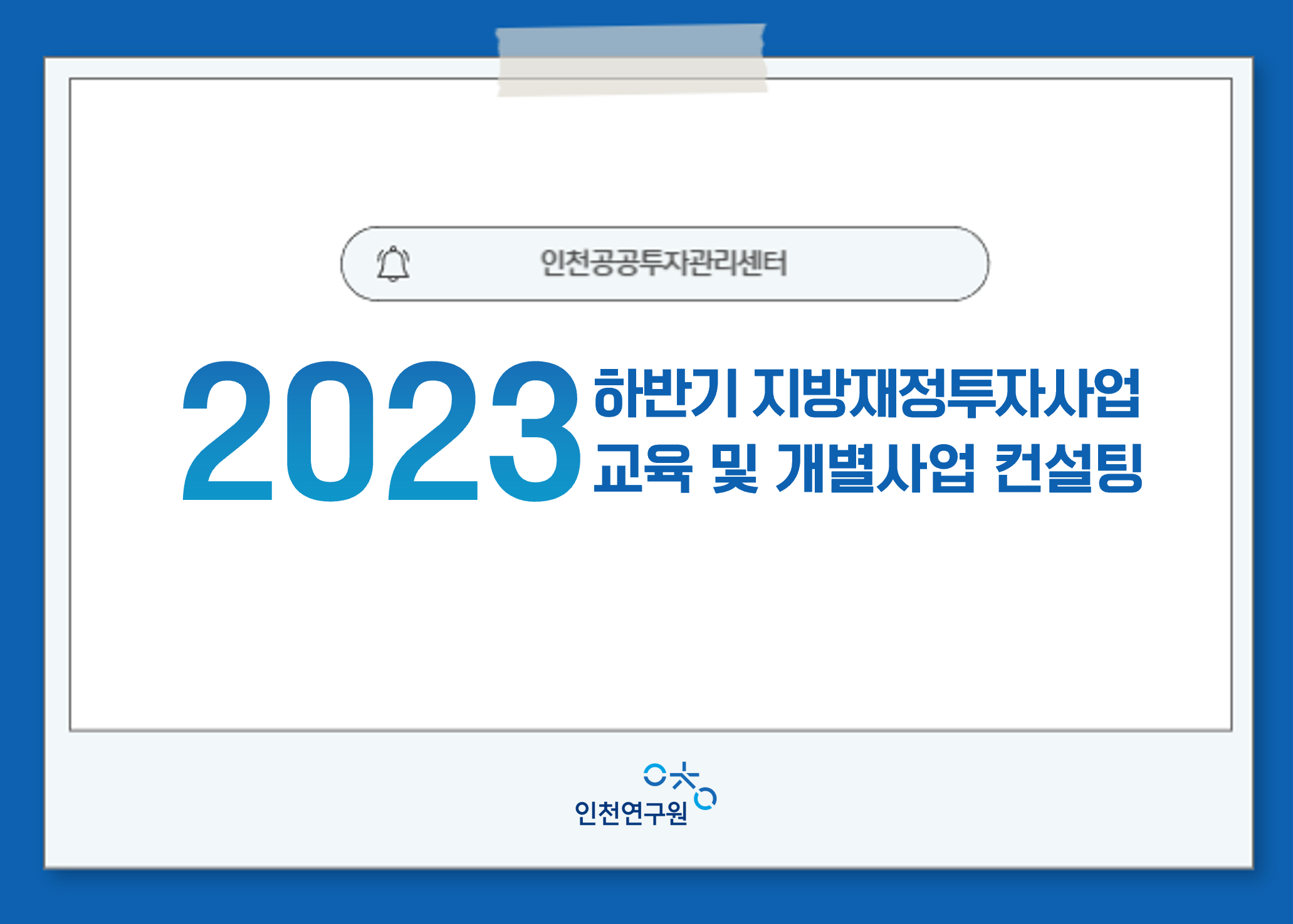개최 배경 및 목적 o 지방 또는 중앙 투자심사 사업에 대하여, 투자심사 이전 또는 타당성조사 준비중, 투자심사 이후 사업 추진 과정에서 추가로 검토할 사안이 있는 사업을 대상으로 컨설팅(맞춤형 자문) 진행 o 해당 사업이 원활히 추진될 수 있도록 본 행사를 실시하며, 시·군·구 유관부서(사업부서 등) 공무원에게 지방재정투자심사 업무 절차 및 심사의뢰서 작성 등의 교육을 시행함으로써 실무 담당자의 이해도 증진 및 지방재정투자심사 내실 향상 도모 행사개요 o 일시 : 2023년 11월 2일(목)~3일(금) o 장소 : 송도 G타워 및 홀리데이 인 호텔 o 주제 : 투자심사 관련 교육 및 재정투자사업 컨설팅 o 행사진행 : 대면교육 및 대면 컨설팅 o 주최 : 인천광역시(재정담당관실), 인천연구원 o 강사 : 인천공투센터, 한국지방행정연구원 지방투자사업관리센터(LIMAC) - (개회 및 강연) : 인천연구원 인천공공투자관리센터 박사, LIMAC 박사 - (개별사업 컨설팅) : 인천공공투자관리센터, LIMAC 박사- 등록일 2023.11.04