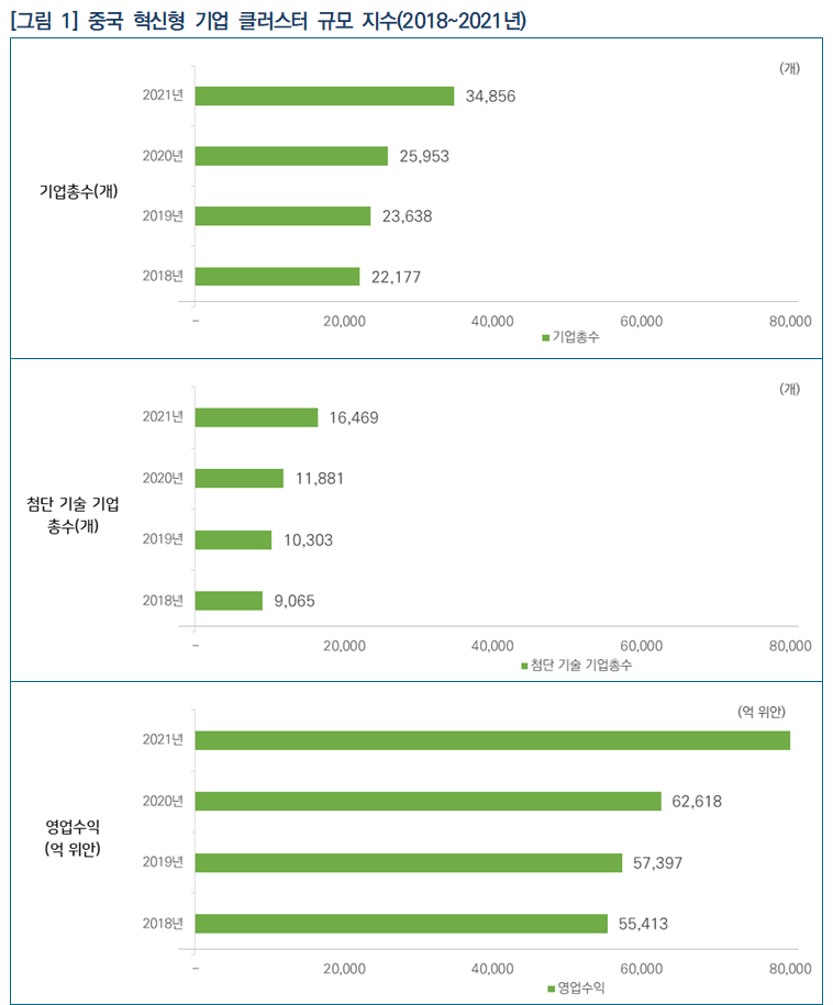 2021년 혁신형 산업 클러스터 146개에 분포한 첨단 기술 기업 수는 16,469개로 47.25%로 증가함.