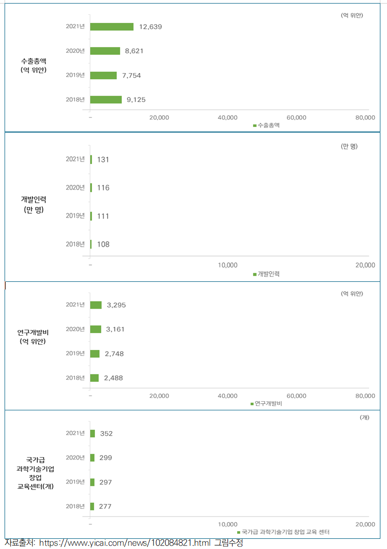 - 이들 기업의 영업총이익은 5조 5,400억 위안, 총 인력 수는 415만 명, 총수출액은 9,000억 위안을 초과하며 순이익 약 4,500억 위안을 달성함.