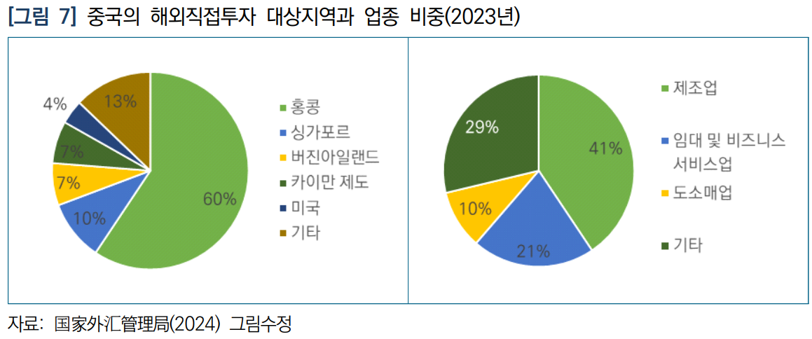 중국의 산업별 해외투자는 제조업 41%, 임대 및 비즈니스 서비스업 21%, 도소매업 10% 순으로 상위 비중을 차지했음.