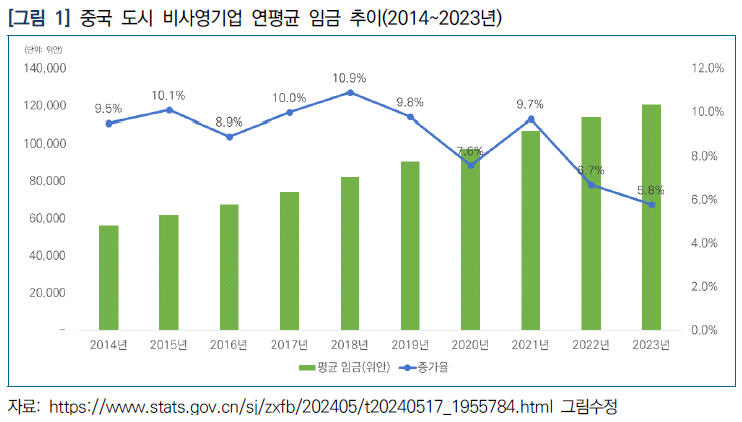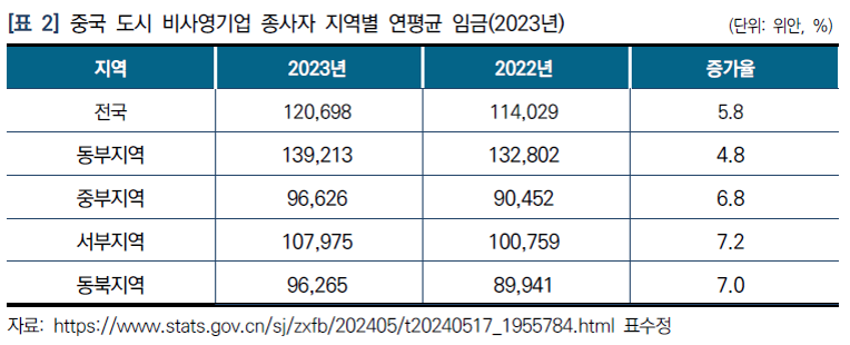 2023년 중국 도시 비사영기업 연평균 임금은 12만 698위안으로 전년 대비 6,669위안 증가하였고 명목성장률은 5.8%, 실질성장률은 5.5%로 집계됨.