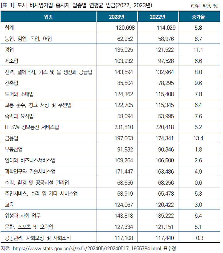<출처: “2023年城镇单位就业人员年平均工资情况” 国家统计局. 2024.5.17.>