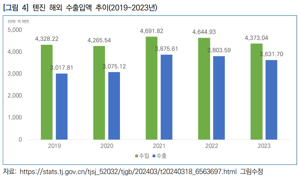 2023년 톈진의 수출입 총액은 8,004.7억 위안으로 전년 대비 3.4% 감소했음.