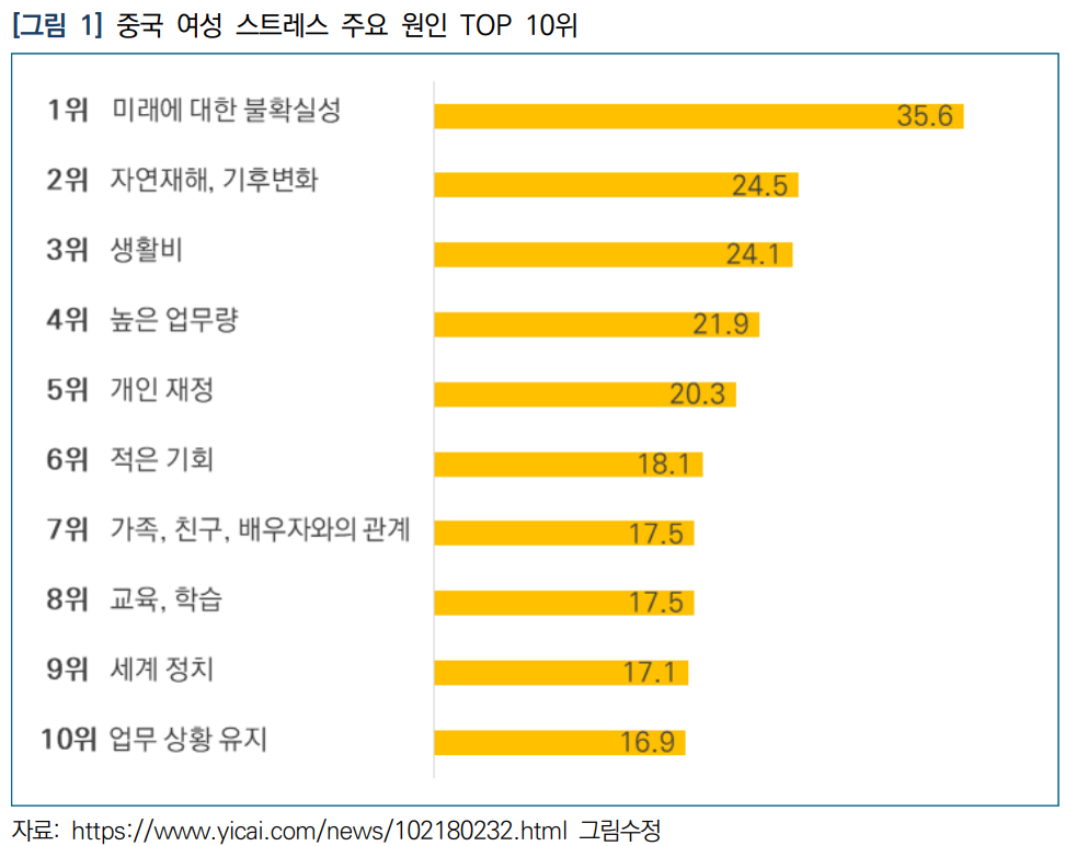 여성의 가장 큰 스트레스는 미래에 대한 불확실성이며, 남성보다 직장 내 성장, 인간관계, 자기 계발 등에 더 많은 어려움을 겪고 있음.