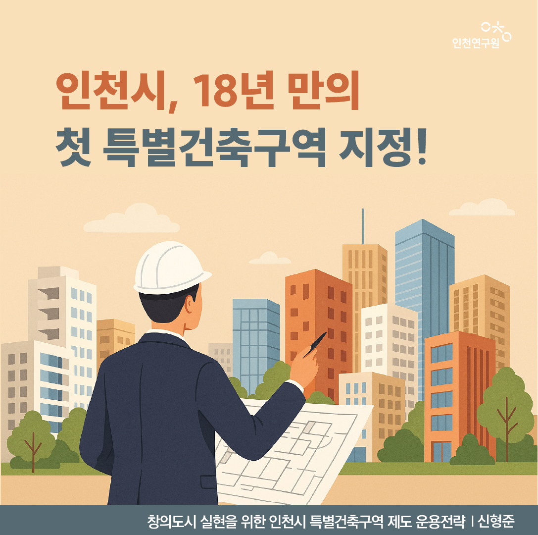 ■ 연구개요 ○ 인천시는 2025년 5월 ‘산곡3 재개발 정비사업구역’을 첫 특별건축구역으로 지정하며, 경직된 규제를 넘어 창의적 도시경관을 창출할 제도적 전환점을 만들었음 ○ 특별건축구역은 「건축법」에 근거해 용적률·높이·일조 등 특례를 유연하게 부여할 수 있어 주거환경의 질과 도시 품격을 동시에 끌어올릴 수 있는 수단이나, 서울과 공동주택 중심의 편중과 공공성 판단의 정성적·비일관성이 한계로 지적됨 ○ 본 연구의 목적은 기존 건축·도시·경관 계획과 연계해 인천만의 전략적 후보지를 발굴하고, 창의도시 전략을 실현하는 실행 플랫폼으로 특별건축구역을 정착시키기 위한 운용전략을 마련하는 데 있음